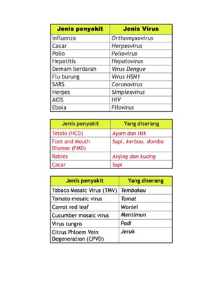 Virus adalah organisme aseluler berukuran kecil yang hanya dapat dilihat dengan mikroskop elektron dan terdiri dari DNA atau RNA yang diselubungi kapsid. Virus bereproduksi dengan menginfeksi sel hidup dan dapat menyebabkan berbagai penyakit pada manusia, hewan, dan tumbuhan. Meskipun banyak virus berbahaya, beberapa dapat dimanfaatkan dalam pengembangan vaksin untuk melawan infeksi.