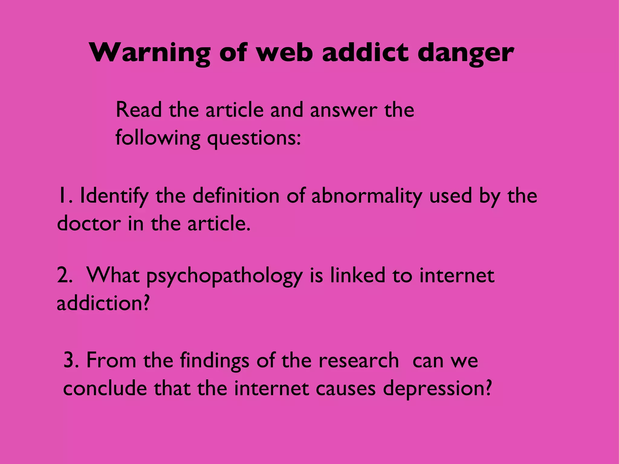 The document discusses the biological approach to explaining psychopathology. It states that according to this approach, abnormal behavior reflects an underlying disease process or illness. It lists three main biological causes of psychopathology: 1) an imbalance in neurotransmitters like serotonin or dopamine, 2) abnormal neuroanatomy such as structural abnormalities in the brain, and 3) genetics where mental illnesses can be inherited. The document instructs the reader to read about genetic inheritance and lists questions to answer regarding defining abnormality, linking internet addiction to a psychopathology, and whether internet causes depression.