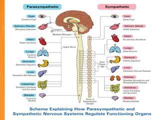 The document discusses the nervous system and its main components. It describes that the nervous system comprises two main divisions: the central nervous system (CNS) consisting of the brain and spinal cord, and the peripheral nervous system (PNS) consisting of nerve fibers connecting receptors to the CNS. Neurons are the basic functional units of the nervous system and transmit electrochemical signals. The brain is the master organ that controls and integrates the activities of the entire nervous system. The brain is divided into three main parts: the forebrain, midbrain, and hindbrain. The document provides details on the structure and functions of the key components of the nervous system.