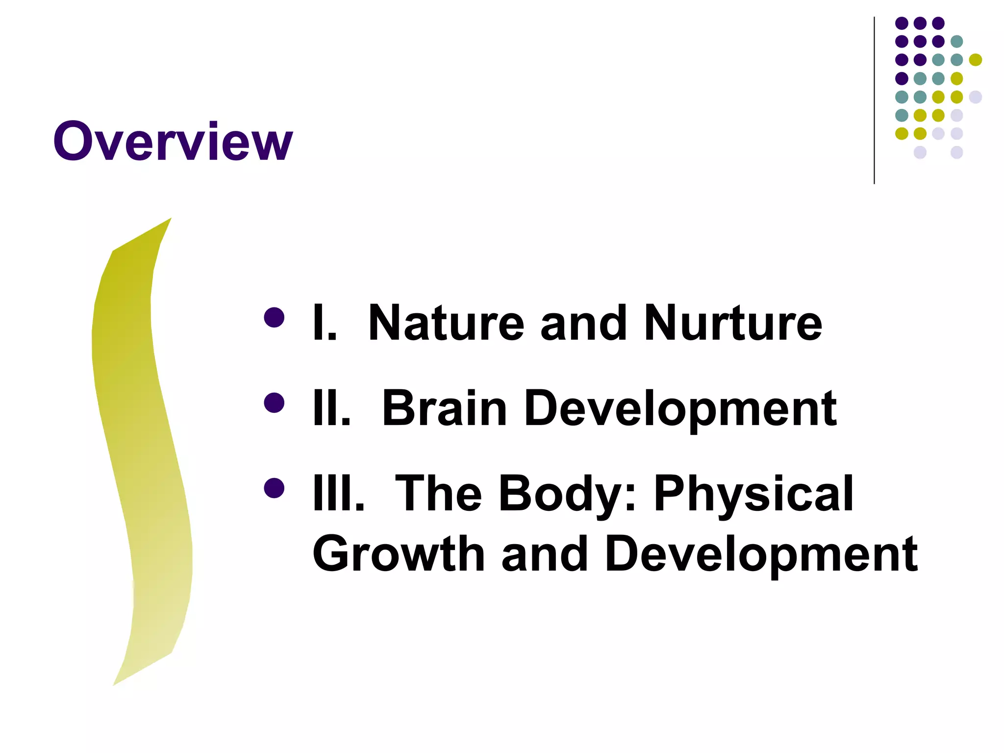 This document summarizes key points from Chapter 3 of the textbook "How Children Develop" regarding the influence of nature and nurture on development. It discusses how both genetic and environmental factors shape individuals' characteristics in complex ways. Specific topics covered include brain development, the interplay between genes and the environment, sensitive periods of development, the importance of experience in shaping the brain, and physical growth patterns in children.
