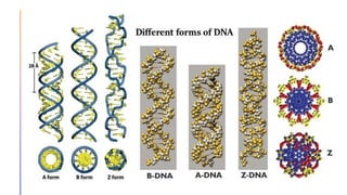 The document discusses nucleic acids, detailing their discovery, structure, and functions, including DNA and RNA types. It covers the history of nucleic acid research, key figures involved, and essential concepts like base pairing and the structure of DNA. It also delves into various RNA types and their roles in protein synthesis and gene expression regulation.