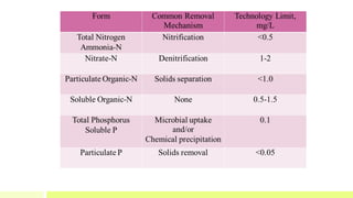 Biological nutrient removal (BNR) is a wastewater treatment process designed to eliminate nitrogen and phosphorus to prevent eutrophication in water bodies. The document details BNR methodologies, including biological nitrogen and phosphorus removal, and various treatment processes such as integrated fixed film activated sludge and membrane biological reactor processes. It also highlights the challenges of implementing BNR technology, emphasizing the need for trained personnel and effective modeling for operation.