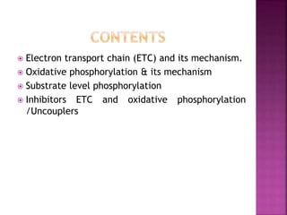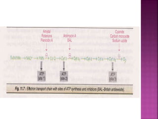 The document discusses the electron transport chain and oxidative phosphorylation. It describes how electrons from nutrients are transferred through enzyme complexes in the mitochondrial membrane to generate a proton gradient. This gradient is then used by ATP synthase to phosphorylate ADP into ATP through oxidative phosphorylation. Inhibitors of the electron transport chain like cyanide and antimycin A prevent this process, while uncouplers allow electron transport without phosphorylation.