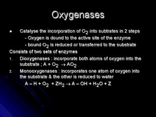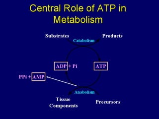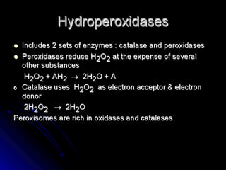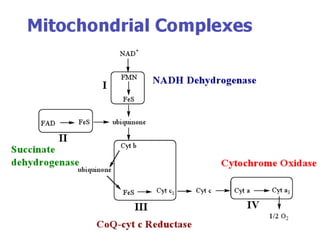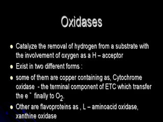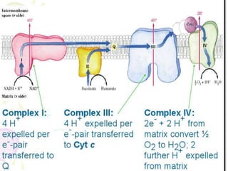 Biological oxidation is the process by which organic substances like carbohydrates, fats, and proteins release energy through redox reactions in cells. This energy is captured in the form of ATP, which is used to power various cellular processes. The electron transport chain located in the inner mitochondrial membrane facilitates the transfer of electrons from electron carriers like NADH and FADH2 to oxygen. This releases energy to synthesize ATP through oxidative phosphorylation and substrate-level phosphorylation. Key components of the electron transport chain include complexes I-IV which contain enzymes, cofactors, and cytochromes that sequentially pass electrons from one to the next until they reach oxygen, the final electron acceptor.