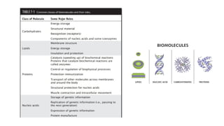 The document provides an overview of biomolecules, summarizing their classifications, structures, and functions. It categorizes biomolecules into carbohydrates, lipids, proteins, and nucleic acids, detailing their properties and roles in living organisms. Key elements like functional groups and biochemical processes such as protein synthesis and energy transfer are also discussed.