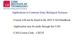 This document provides information on common entry biological science courses at a university, including BSc degrees in Pharmaceutical Biotechnology, Nutrition and Health Science, and Herbal Science. It details the course descriptions and durations, typical CAO entry scores from 2014, employment destinations for graduates, and career opportunities in fields like quality control, research and development, education, and the healthcare and food industries. It also provides contact information for viewing a departmental video and brochure or arranging a visit.
