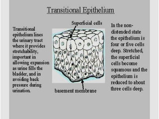 This document discusses the different types of epithelial tissue at the tissue level of biological organization. It describes four main types of epithelial tissue: simple epithelium, pseudostratified epithelium, stratified epithelium, and transitional epithelium. Within each type, epithelial tissues are further classified based on their cell arrangement (layers) and cell shapes (squamous, cuboidal, columnar, transitional). Examples of each epithelial tissue type and their locations in the body are provided.