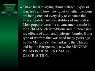 The document discusses biological warfare and biological weapons. It defines biological warfare as using biological agents like bacteria, viruses, and fungi to harm or kill humans, animals, and plants. It provides examples of historical uses of biological weapons and diseases used in warfare like anthrax and glanders. The document outlines the development of biological weapons by nations in the 20th century and bans on their use through treaties. However, it notes that some countries still maintain secret biological weapons programs today in violation of treaties.