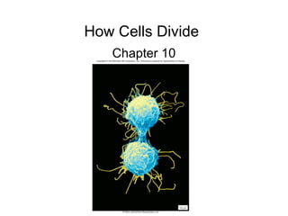 This document provides an outline and overview of chapter 10 on cell division. It discusses bacterial cell division through binary fission and the replication of the bacterial chromosome. It then summarizes eukaryotic cell division, including the stages of mitosis (prophase, prometaphase, metaphase, anaphase, telophase) and cytokinesis. It also discusses the structure and compaction of eukaryotic chromosomes, the key events of the cell cycle including checkpoints, and the role of cyclin-dependent kinases in regulating the cell cycle. The document is accompanied by figures and tables to illustrate the concepts discussed.