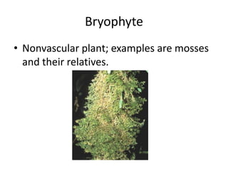 Bryophytes are nonvascular plants like mosses and liverworts that reproduce using structures like gemmae, protonemata, antheridia, and archegonia. They lack vascular tissue and can only absorb water a short distance from the ground. Bryophytes have life cycles dependent on water and their gametophyte stage is what carries out photosynthesis and is the main visible structure.