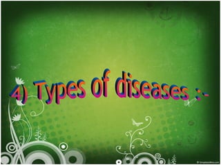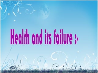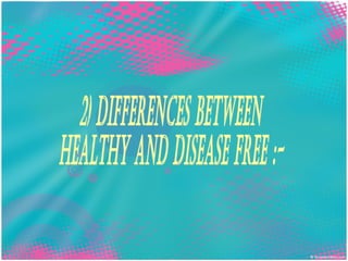 The document discusses the key conditions required for good health, which include a good physical and social environment with clean surroundings, sanitation, garbage disposal and clean water, as well as good economic conditions with job opportunities and ability to afford nutritious food. It states that health is a state of physical, mental and social well-being, as opposed to merely being disease-free. Maintaining individual health relies on both personal factors as well as environmental conditions.