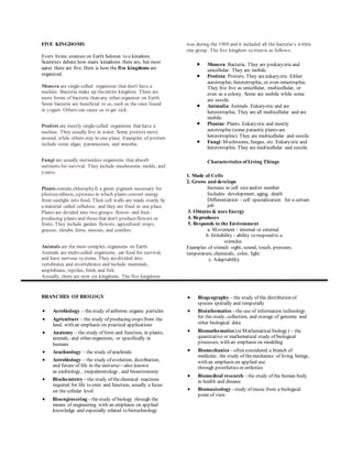 The document discusses biology and its branches. It begins by defining biology as the study of life, including the structure, function, growth, evolution, distribution, and taxonomy of living organisms. Modern biology is broad and composed of many branches and subdisciplines, but it is unified by concepts like recognizing the cell as the basic unit of life and evolution as driving the creation of new species. The hierarchy of biological organization extends from atoms to entire biospheres. Some key branches of biology mentioned include anatomy, ecology, genetics, microbiology, and zoology.