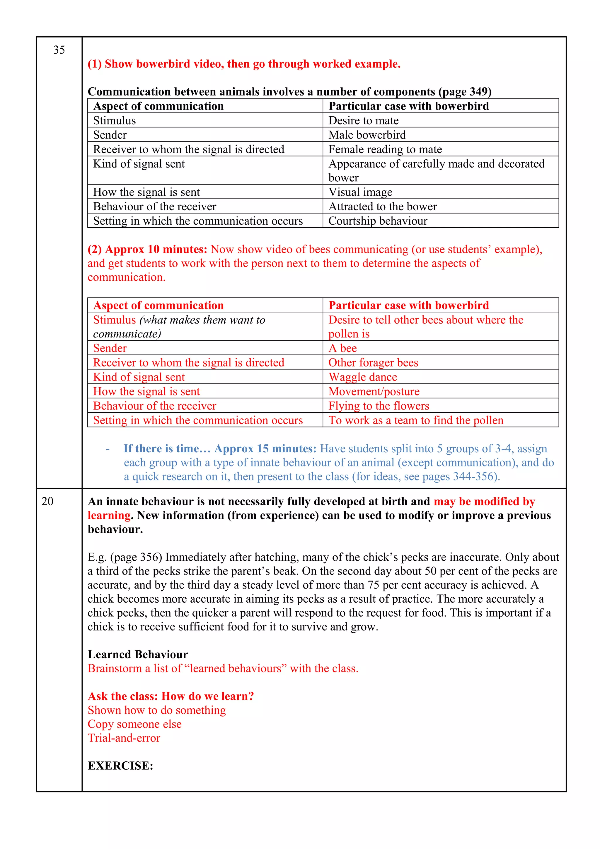 This document provides a summary of a biology lesson on behavioral adaptations. The 70 minute lesson was held in a science laboratory and aimed to distinguish between innate and learned behaviors in animals. The teacher began with definitions and examples of innate behaviors like rhythmic, communication, reproductive, competitive, and territorial behaviors. Examples of learned behavior were also provided. Videos were then shown to illustrate communication behaviors in bowerbirds and bees. Students worked in groups to research different innate animal behaviors. The lesson concluded with a discussion of how behaviors can be modified by learning and an experiment was proposed to test if a duckling's following behavior was innate or learned.