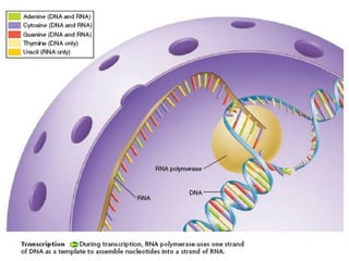 3) RNA acts as a messenger to transfer DNA instructions to the cell. Transcription and translation lead to protein synthesis on ribosomes according to the genetic code.