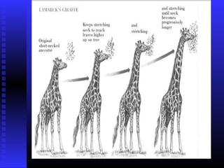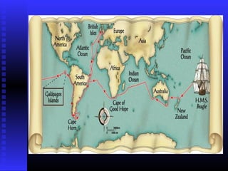 Charles Darwin developed the theory of evolution by natural selection based on observations from his voyage on the HMS Beagle. He noticed variations between species on different islands and in the fossil record. Darwin proposed that organisms produce more offspring than can survive, and individuals with traits better suited to the environment tend to survive and reproduce, passing on those traits. Over many generations, this process of natural selection leads to descent with modification and the evolution of new species.