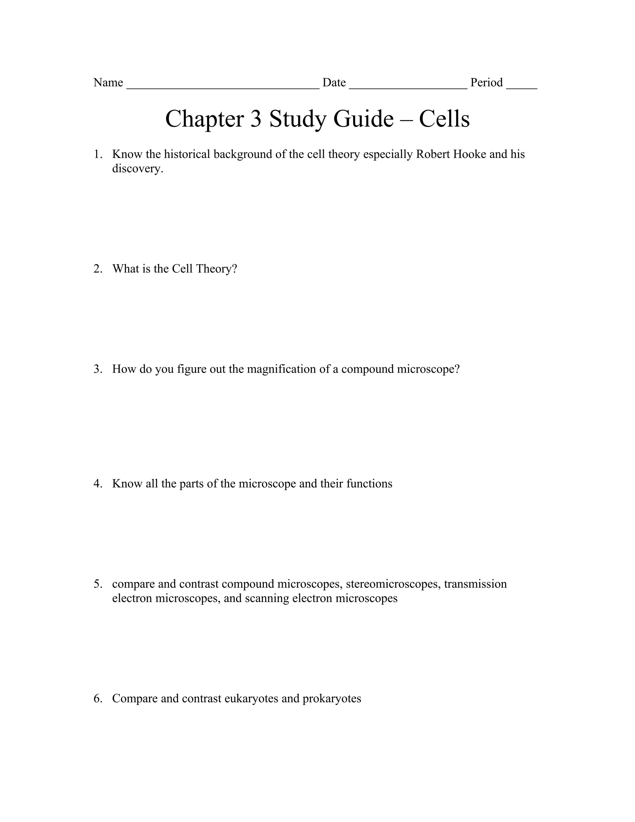 This study guide covers key concepts about cells including the cell theory, parts of microscopes, differences between cell types and organisms, cell structures, transport mechanisms like diffusion and osmosis, and levels of organization in multicellular organisms. Students are instructed to learn about early discoveries in cell biology, organelles, differences between plant and animal cells, the cell membrane and cell wall, and cellular processes like endocytosis and exocytosis.