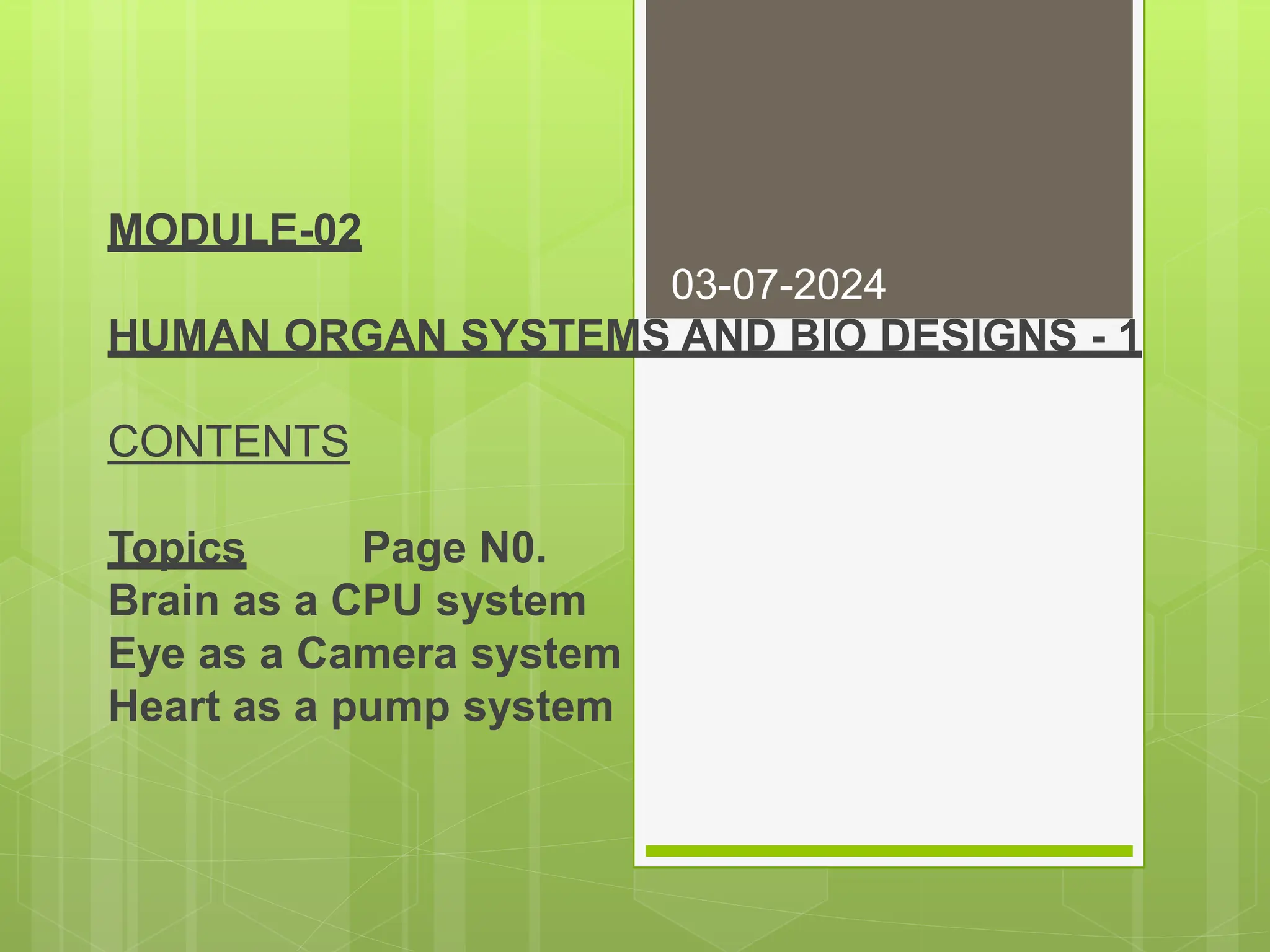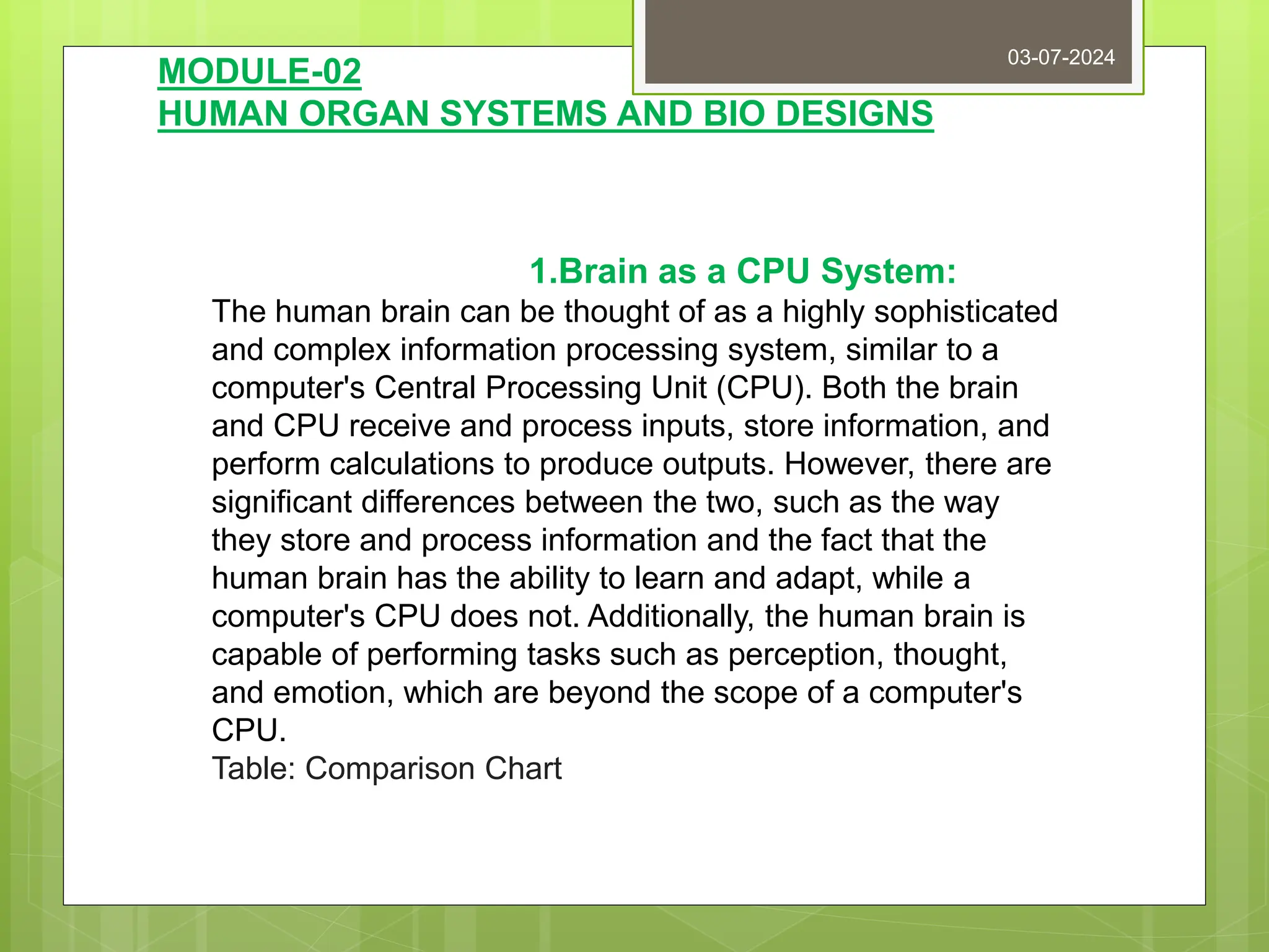 This document discusses the comparison between various human organ systems, particularly the brain and eye, with computer systems, highlighting their functions, structures, and complexities. It explains how the brain operates like a CPU, processing information through neurons and neurotransmitters, while the eye functions as a camera system, capturing and converting light into images. Additionally, it explores advanced technologies such as brain-machine interfaces and robotic prosthetics aimed at enhancing human capabilities and addressing disorders like Parkinson's disease.