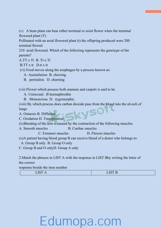 This document contains instructions for a biology exam for Form Four students. It consists of three sections - Section A with multiple choice and matching questions worth 20 marks, Section B with short answer questions worth 60 marks, and Section C where students must answer one of three extended response questions worth 20 marks. The exam is 3 hours long and students must write in blue or black ink, except for diagrams which must be drawn in pencil. Cellphones and calculators are not allowed. The document provides sample questions from Sections A and B to illustrate the format and content assessed on the exam, which covers topics like cellular respiration, plant structures and functions, human anatomy and physiology.