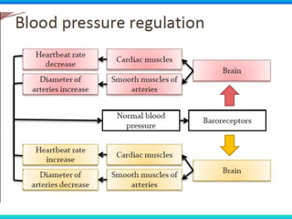 The circulatory system transports blood throughout the body to provide nutrients and oxygen to tissues and remove waste. Red blood cells carry oxygen and carbon dioxide, containing hemoglobin which reversibly binds oxygen. White blood cells help fight infection through phagocytosis and antibody production. Platelets initiate clotting to stop bleeding from broken blood vessels. Together, blood transports substances, defends against pathogens, and maintains homeostasis.