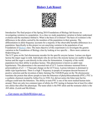 This biology lab report investigates genetic variation in a population of students in a Foundations of Biology class. The report analyzes variation at two loci - the TAS2R38 gene, which determines the ability to taste bitterness, and the LCT gene, which encodes the lactase enzyme. DNA was extracted from students and PCR/restriction enzyme digestion was used to determine genotypes. The results found that neither locus was in Hardy-Weinberg equilibrium, supporting the hypothesis that the population violates conditions of the Hardy-Weinberg principle like random mating.