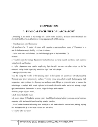 The document discusses the importance of organizing and managing a biology laboratory safely and effectively. It emphasizes that the laboratory is an essential part of biology education, allowing students to conduct hands-on experiments and activities that reinforce classroom lessons. To function properly, a biology lab requires specific physical facilities, equipment, safety protocols, and record-keeping. It provides lists of recommended consumable and non-consumable supplies, guidelines for maintenance and organization, and considerations for laboratory design and management to create an optimal learning environment.