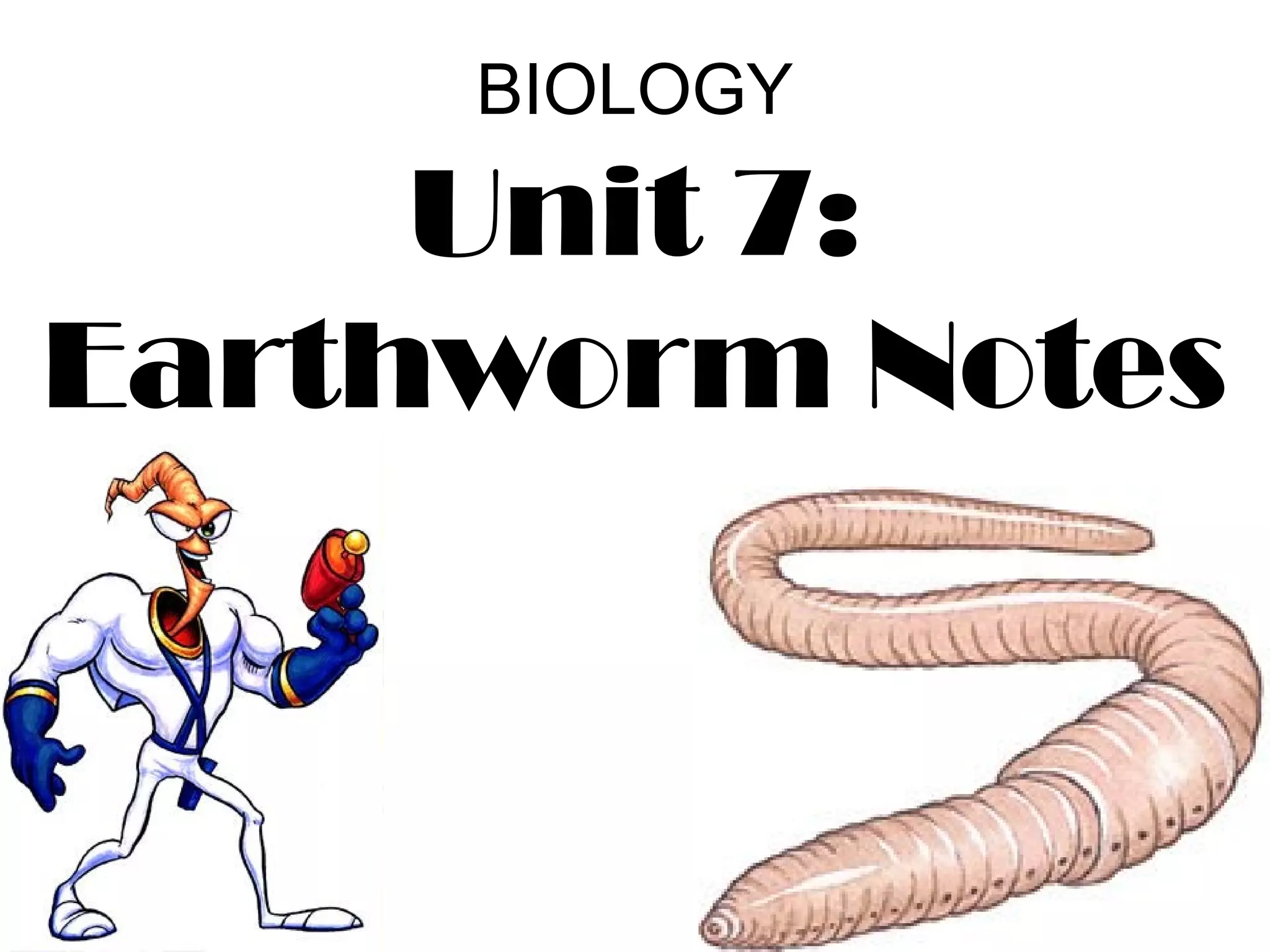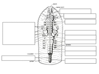 The document provides notes on the external and internal anatomy of earthworms. Externally, earthworms have setae (tiny hairs) in rings along their segmented body and a clitellum (knob) near the center that secretes fluid to enclose fertilized eggs. Internally, the main organs are located between the mouth and clitellum, including the ganglia which acts as the worm's brain, and aortic arches that circulate blood and nutrients. The digestive system includes a pharynx, esophagus, crop, gizzard, and intestine for breaking down and transporting food. Reproductive organs include seminal receptacles that receive sperm for fertilization and seminal vesicles that
