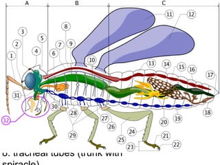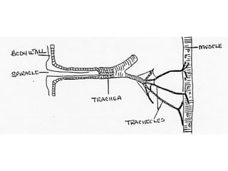The document describes the gas exchange system in insects. It explains that insects have a branching network of tracheoles that carry air to tissues and muscles. This structure provides a large surface area for gas exchange. Oxygen is transported directly to tissues via tracheoles, unlike in humans where oxygen is transported via blood. The document also contains questions about gas exchange in insects and diagrams showing spiracle movements.