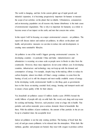 This document discusses air pollution as a major environmental concern. It describes how industrialization and urbanization in developing countries like China and India has increased air pollution due to reliance on coal and inadequate infrastructure. Indoor air pollution from burning biomass for cooking also causes millions of deaths annually. The document outlines health impacts of air pollution like decreased IQ, respiratory diseases, and cancer. It proposes developing sustainable cities and green technologies like "super trees" and green buildings to help reduce air pollution and its effects.