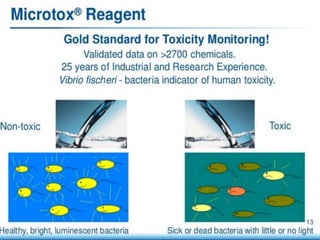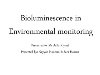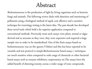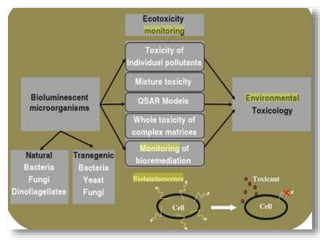 Bioluminescence, the production of light by living organisms, can be used to sensitively monitor pollution through assays that detect changes in bioluminescence caused by toxic substances. One of the earliest assays was developed using the bacterium Vibrio fisheri, measuring inhibition of its bioluminescence by pollutants. Recombinant bacteria like E. coli transformed with bioluminescence genes have also been used for biomonitoring due to their genetic tractability and ability to detect a wide range of pollutants in various environments. Dinoflagellates exhibiting bioluminescence have further been employed for toxicity assessments of metals and other contaminants in aquatic systems.