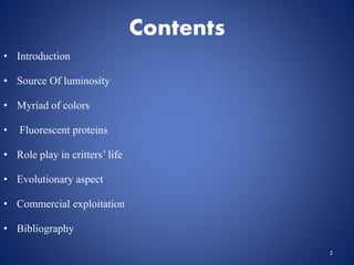 Bioluminescence is the production of light by living organisms. It occurs through a chemical reaction between luciferin and luciferase or photoproteins within photophores in organisms. Bioluminescence serves defensive, offensive, and communicative functions for marine creatures found throughout the water column. It has evolved as an adaptation for survival in the deep sea where little sunlight penetrates. Fluorescent proteins like green fluorescent protein are an important tool in research due to their ability to act as reporter genes and have commercial applications like bioluminescent crops.