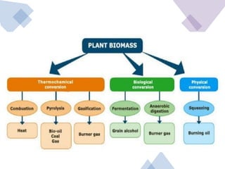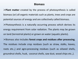 This document discusses biomass and biogas. It defines biomass as plant matter created through photosynthesis. Biomass includes terrestrial and aquatic plants, crop residues, and organic waste. Biogas is produced through the anaerobic digestion of biomass by bacteria. It is composed primarily of methane and carbon dioxide. The document outlines the three stages of biogas production and describes common types of biogas digesters, including floating dome, fixed dome, Janata, and Deenbandhu models. It discusses the applications of biogas for lighting, cooking, and electricity generation.