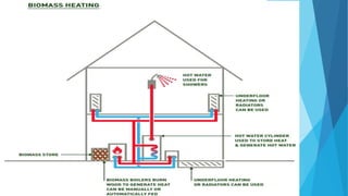 Biomass is organic material from plants and animals that can be used as a renewable source of energy. The sun's energy is used by plants through photosynthesis to produce biomass, which includes plant roots, stems, branches and leaves. This biomass can then be directly combusted to produce heat for applications like space heating or electricity generation.