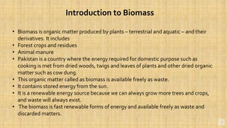 Biomass is organic matter from plants and animals that can be used as a renewable source of energy. It includes materials like wood, manure, and plant waste. Biomass contains stored solar energy and is considered renewable because plants and organic matter can regrow or be replenished. There are several methods to extract energy from biomass, including direct combustion, gasification, anaerobic digestion, pyrolysis, and fermentation. Each method has advantages such as being renewable and producing a usable fuel, though they also have disadvantages like emissions or inefficient energy conversion. Pakistan relies on biomass such as wood for domestic energy needs given its availability.