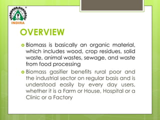 Dr. Sudhir Puloria invented a biomass gasifier that converts solid biomass fuels like wood and agricultural waste into a combustible gas. There are two types - a simple natural gasifier priced at Rs. 8000 and a forced draft model priced at Rs. 15000. The gasifier provides a sustainable energy source for rural areas by utilizing agricultural waste and has benefits such as reducing firewood consumption and smoke. Challenges include adequate land and waste collection, but opportunities exist in powering atta chakkis and replacing diesel generators. The gasifier offers environmental and cost benefits over fossil fuels.