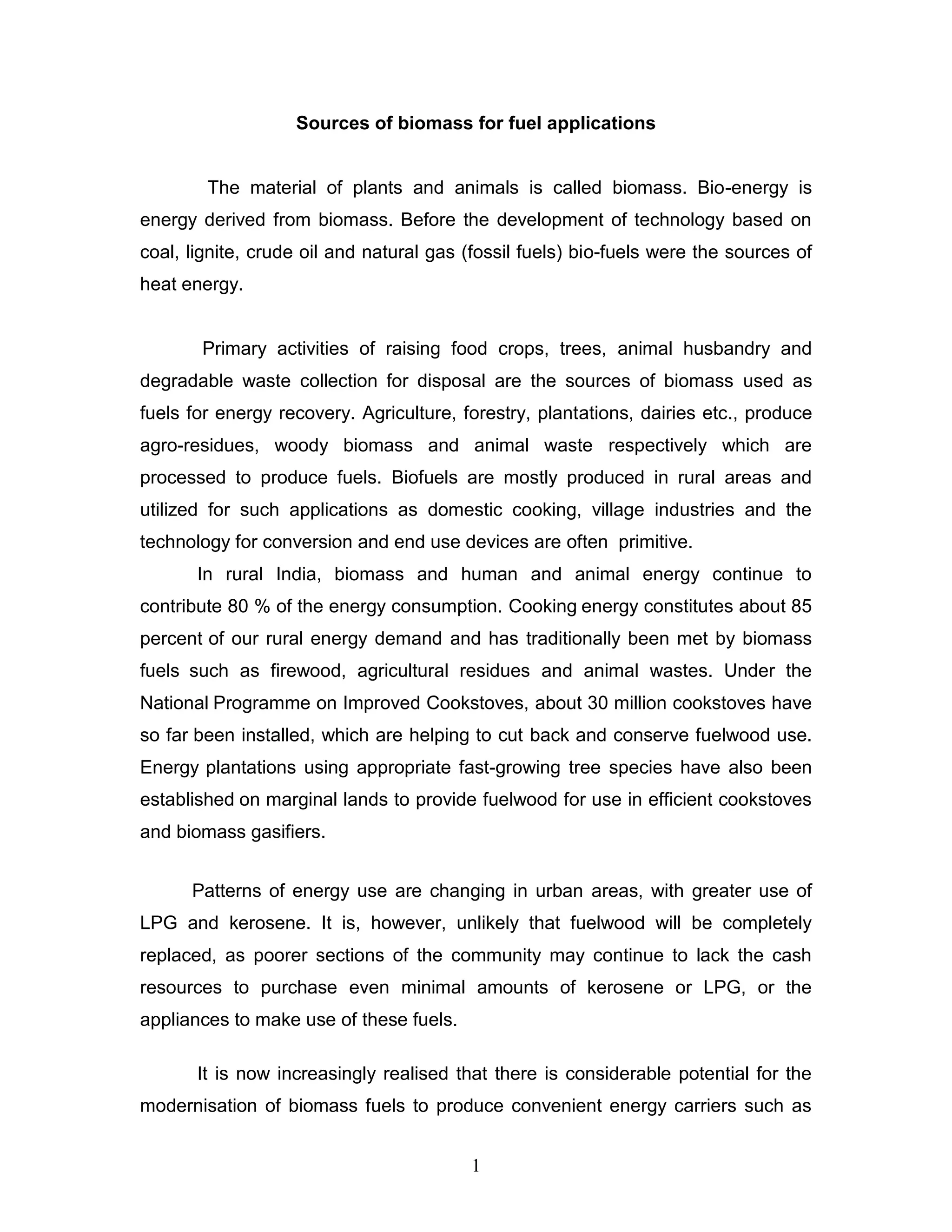 This document discusses various sources of biomass that can be used for fuel applications. It describes how biomass from agriculture, forestry, plantations and animal husbandry can be processed into fuels. Primary sources include crop residues, woody biomass, animal waste and energy crops. Technologies for converting biomass include direct combustion as well as thermochemical and biochemical processes like pyrolysis, gasification and anaerobic digestion. The document also provides estimates of biomass potential from different sources in various countries and discusses preparation and densification of biomass through processes like drying, grinding and briquetting to improve its fuel properties.