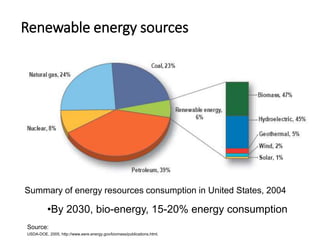 This document summarizes information on renewable energy sources from biomass. It provides a history of bioenergy use in the United States from the 1850s to present day. It also outlines various biomass feedstocks and waste materials that can be converted to bioenergy through processes like combustion, gasification, anaerobic digestion, and fermentation. The applications of bioenergy include biofuels like ethanol, butanol and biodiesel for transportation; bioheat for heating buildings; and bioelectricity from combustion or microbial fuel cells.