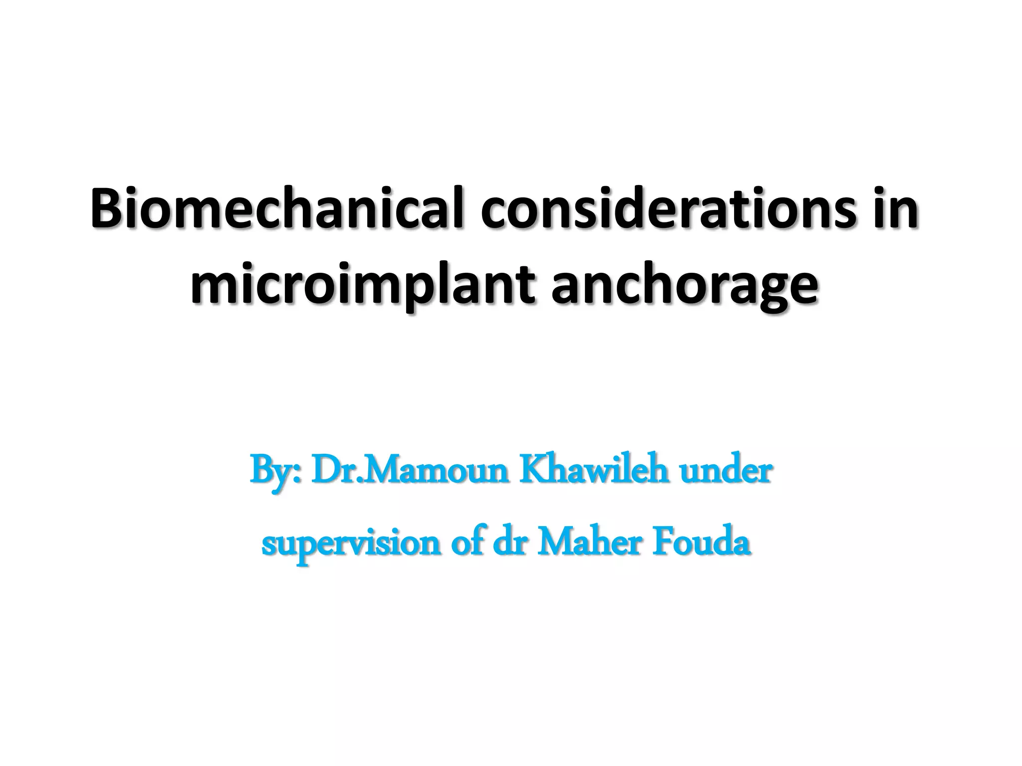 The document discusses various biomechanical considerations for using microimplants in orthodontic tooth movement. It describes how the placement location and height of microimplants, as well as the force applied, can be used to produce different types of tooth movement. Specifically, it discusses how low-, medium-, and high-pull microimplant mechanics can be used to control the rotation of the maxillary and mandibular occlusal planes during anterior retraction. It also describes how microimplants can enable intrusion of anterior and posterior teeth as well as other tooth movements.