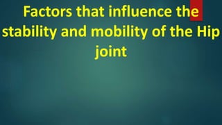 The document discusses several factors that influence the stability and mobility of the hip joint:
