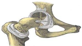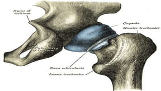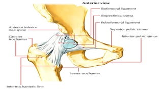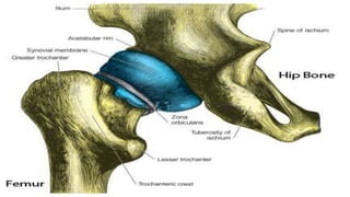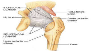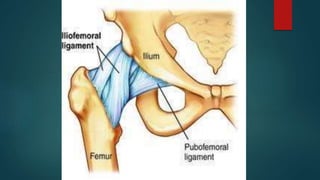 2) It outlines the ligaments of the hip joint - the iliofemoral, pubofemoral, ischiofemoral, transverse acetabular, and ligament of head of femur - and their roles in limiting various movements.