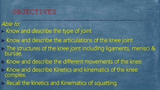 This document provides information about the knee complex, including its types of joints, articulations, structures, movements, and kinetics. It describes the femur and tibia articular surfaces, menisci, ligaments, bursae, and the patellofemoral joint. It also analyzes squatting movements, noting the roles of the hip, knee, and ankle joints during both the lowering and lifting phases, as well as variations in squat depth.