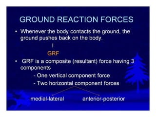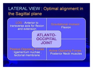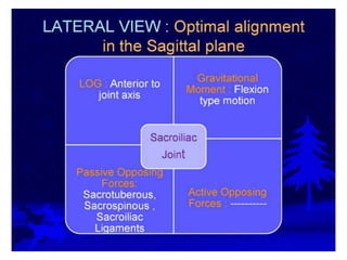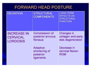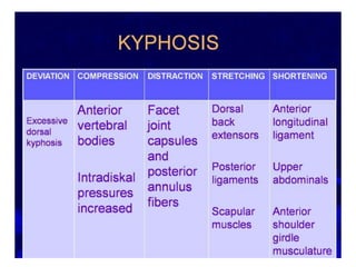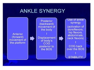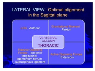This document provides an overview of biomechanics of posture. It defines static and dynamic posture and describes the major goals and elements of postural control, including maintaining the body's center of gravity over its base of support and stabilizing the head vertically. It discusses perturbations that can disrupt posture and the fixed and change-in-support synergies used to regain equilibrium. Key aspects of posture such as external forces, ground reaction forces, and optimal alignment are summarized. Common postural deviations are also outlined.