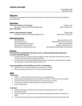 Aaron Gaylord is seeking a co-op position in biomedical or general engineering available from May to December 2016. He is currently pursuing a Bachelor of Science in Biomedical Engineering from Rochester Institute of Technology, expected to graduate in May 2019, and has an Associate of Science in Biomedical Engineering from Bunker Hill Community College. His relevant coursework includes fluid mechanics, biomaterials science, biomechanics, and cell and molecular biology. For projects, he has worked on analyzing antibiotic resistance gene recombination through restriction enzyme digestion and DNA ligation, and measuring cell viability and adhesion for 3T3-L1 fibroblasts seeded on various materials. His skills include aseptic techniques, cell culturing, microscopy, gel electrophoresis