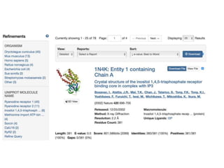 This document discusses investigating protein structure using online tools. It provides an overview of protein structure, describing how amino acid sequences fold into specific three-dimensional structures, including alpha helices, beta strands, and membrane proteins. It also mentions several online tools that can be used to analyze protein sequences and structures, such as SCOP, CATH, and tools to analyze domains, folds, interactions, and structural variations.
