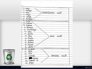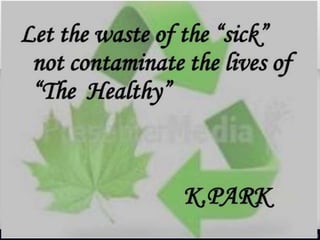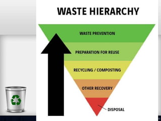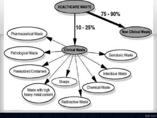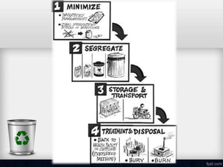 The document discusses waste management in hospitals. It defines medical waste and outlines the purposes of proper waste management such as preventing infections. It describes the different types of hospital waste and provides color coding for waste containers. The document discusses approaches to waste management including minimization, segregation, storage, treatment, and disposal. Common treatment methods like autoclaving, incineration and deep burial are explained. Finally, the roles and responsibilities of hospital administration, nurses, and other staff are outlined.