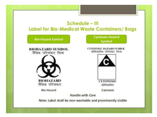 The document provides an overview of the Bio-Medical Waste Management (Amendment) Rules 2018 in India. It discusses key aspects of the original 1998 rules and subsequent amendments, including categories of biomedical waste, segregation and handling requirements, and responsibilities of occupiers and operators. The 2018 amendments updated guidelines for waste treatment, phased out certain plastics, established timelines for waste tracking systems, and modified reporting procedures. Proper management of biomedical waste is important for public health and environmental protection.