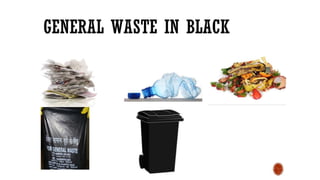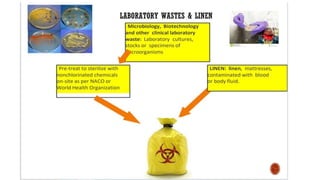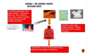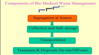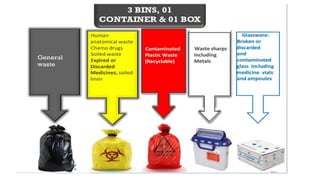 The document outlines the management program for biomedical waste (BMW), highlighting its objectives to prevent infections and environmental pollution while ensuring safe waste handling. It details regulations, waste classification with color coding, and responsibilities for healthcare workers in managing BMW. Key practices include segregation at the source, limited storage time, and adherence to specific waste handling procedures.