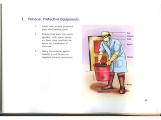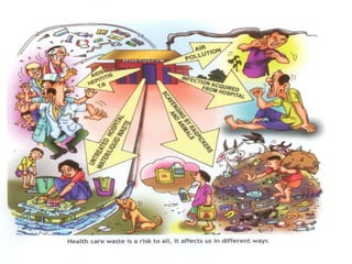 The document discusses guidelines for proper management of biomedical waste in hospitals and healthcare facilities. It defines biomedical waste and outlines its various categories. It recommends appropriate treatment and disposal methods for different waste types, including incineration, autoclaving, deep burial and chemical treatment. The rules specify procedures for waste segregation, storage, transportation, and training of staff. Hospitals should establish waste management committees and coordinate with regulatory authorities to minimize waste and ensure compliance with safety standards.