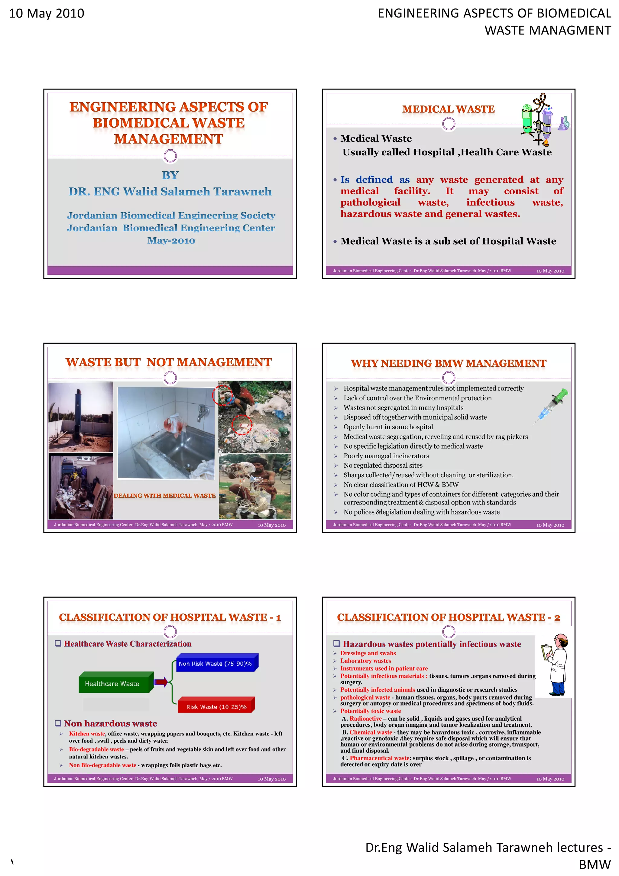The document discusses biomedical waste management. It defines biomedical waste as waste generated at medical facilities that may include pathological, infectious, hazardous, and general wastes. The document notes that biomedical waste management in Jordan is poorly implemented, as wastes are often not properly segregated and disposed of. It provides classifications of different types of biomedical wastes and guidelines for their proper color-coding, storage, transportation, treatment and disposal.