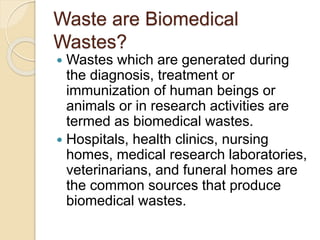 Biomedical waste is generated from medical activities and poses health hazards such as disease spread and pollution. Proper segregation and treatment methods like incineration, autoclaving, and microwave treatment are crucial for safe disposal. Effective management includes categorizing waste and ensuring it is treated to prevent environmental contamination.