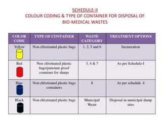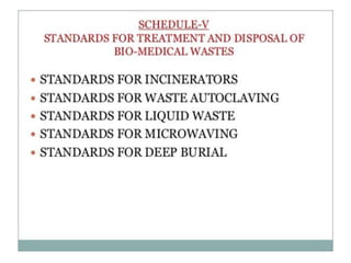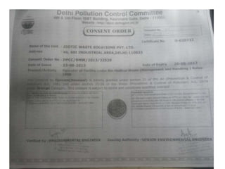 The document summarizes the common biomedical waste treatment process at BIOTIC WASTE SOLUTION in Delhi, India. It discusses that the facility treats waste from around 700 hospitals totaling around 7000 beds. The waste is collected, sorted by color coding, and treated using various processes. Yellow bag waste is incinerated, while blue/red bag waste is autoclaved and shredded. The incinerated ash and treated water undergo further processing before safe disposal. The facility aims to safely and effectively treat the biomedical waste generated at large healthcare centers in the region.